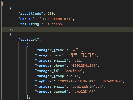 위 사진처럼 parameter와 resultCode, resultMsg등을 위에 빼놓고, 디비 결과값을 리스트로 보여주고 싶을 때